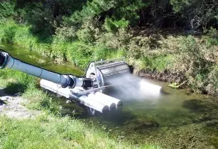 The device is a water-driven rotating self-cleaning screen that dependably delivers good water from as little as 100mm in depth, solving the problem of reliably drawing clean water for centrepivot irrigation from a river or canal.